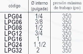 | Codigo | LPG04 1/4 – 350psi max, LPG06 3/8 – 350psi max, LPG08 1/2 – 350psi max, LPG12 3/4 – 350psi max, LPG16 1 – 350psi max, LPG24 1.1/12 – 350psi max, LPG32 2 – 350psi max |