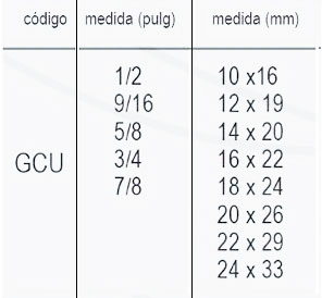 GCU 1/2pulg – 10x16mm, GCU 9/16pulg – 12x19mm, GCU 5/8pulg – 14x20mm, GCU 3/4pulg – 16x22mm, GCU 7/8pulg – 18x24mm, GCU 20x26mm, GCU 22x29mm, GCU 24x33mm