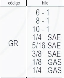 GR 6-1, GR 8-1, GR 10-1, GR 1/4 SAE, GR 5/16 SAE, GR 3/8 SAE, GR 1/8 GAS, GR 1/4 GAS
