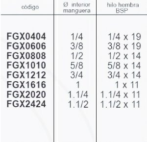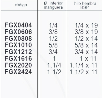 | Codigo | FGX0404 1/4 – 1/4 x 19, FGX0606 3/8 – 3/8 x 19, FGX0808 1/2 – 1/2 x 14, FGX1010 5/8 – 5/8 x 14, FGX1212 3/4 – 3/4 x 14, FGX1616 1 – 1 x 11, FGX2020 1.1/4 – 1.1/4×11, FGX2424 1.1/2 – 1.1/2×11 |