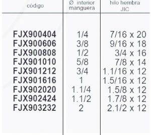 | Codigo | FJX900404 1/4 – 7/16×20, FJX900606 3/8 – 9/16×18, FJX900808 1/2 – 3/4×16, FJX901010 5/8 – 7/8×14, FJX901212 3/4 – 1.1/16×12, FJX901616 1 – 1.5/16×12, FJX902020 1.1/4 – 1.5/8×12, FJX902424 1.1/2 – 1.7/8×12, FJX903232 2 – 2.1/2×12 |