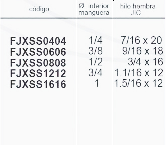 | Codigo | FJXSS0404 1/4 – 7/16 x 20, FJXSS0606 3/8 – 9/16 x 18, FJXSS0808 1/2 – 3/4 x 16, FJXSS1212 3/4 – 1.1/16 x 12, FJXSS1616 1 – 1.5/16 x 12 |