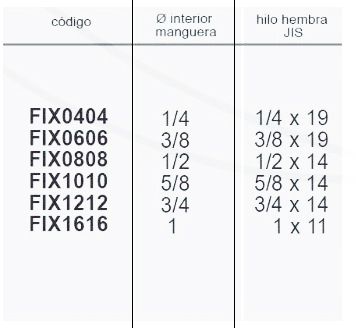 | Codigo | FIX0404 1/4 – 1/4 x 19, FIX0606 3/8 – 3/8 x 19, FIX0808 1/2 – 1/2 x 14, FIX1010 5/8 – 5/8 x 14, FIX1212 3/4 – 3/4 x 14, FIX1616 1 – 1 x 11 |