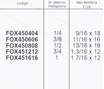 | Codigo | FOX450404 1/4 – 9/16 x 18, FOX450606 3/8 – 11/16 x 16, FOX450808 1/2 – 13/16 x 16, FOX451212 3/4 – 1.3/16 x 12, FOX451616 1 – 1.7/16 x 12 |