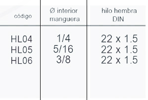| Codigo | HL04 1/4 – 22 x 1.5, HL05 5/16 – 22 x 1.5, HL06 3/8 – 22 x 1.5 |