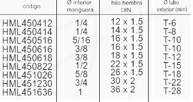 Medidas: manguera 1/4 a 1″, hilo métrico 12 a 36 mm, tubo hidráulico de 6 a 28 mm