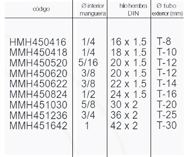 Medidas: manguera 1/4 a 1hilo métrico 16 a 42 mm tubo hidráulico 8 a 30 mm