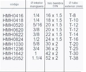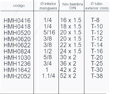 Medidas: manguera 1/4 a 1.1/4 hilo métrico 16 a 52 mm tubo hidráulico 8 a 38 mm