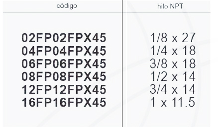 | Codigo | 02FP02FPX45 1/8 x 27, 04FP04FPX45 1/4 x 18, 06FP06FPX45 3/8 x 18, 08FP08FPX45 1/2 x 14, 12FP12FPX45 3/4 x 14, 16FP16FPX45 1 x 11.5 |