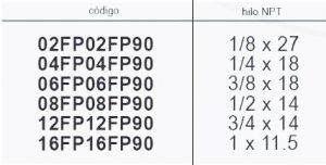 | Codigo | 02FP02FP90 1/8 x 27, 04FP04FP90 1/4 x 18, 06FP06FP90 3/8 x 18, 08FP08FP90 1/2 x 14, 12FP12FP90 3/4 x 14, 16FP16FP90 1 x 11.5 |