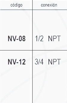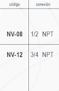 | Codigo | NV08 1/2 NPT, NV12 3/4 NPT |