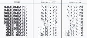 | Codigo | 04MB04MJ90 7/16 x 20 – 7/16 x 20, 04MB06MJ90 7/16 x 20 – 9/16, 06MB04MJ90 9/16 x 18 – 7/16 x 20, 06MB06MJ90 9/16 x 18 – 9/16 x 18, 06MB08MJ90 9/16 x 18 – 3/4 x 16, 08MB08MJ90 3/4 x 16 – 3/4 x 16, 10MB10MJ90 7/8 x 14 – 7/8 x 14, 12MB08MJ90 1.1/16 x 12 – 3/4 x 16, 12MB12MJ90 1.1/16 x 12 – 1.1/16 x 12, 16MB16MJ90 1.5/16 x 12 – 1.5/16 x 12 |