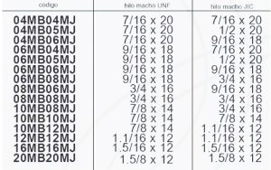 | Codigo | 04MB04MJ 7/16 x 20 – 7/16 x 20, 04MB05MJ 7/16 x 20 – 1/2 x 20, 04MB06MJ 7/16 x 20 – 9/16 x 18, 06MB04MJ 9/16 x 18 – 7/16 x 20, 06MB05MJ 9/16 x 18 – 1/2 x 20, 06MB06MJ 9/16 x 18 – 9/16 x 18, 06MB08MJ 9/16 x 18 – 3/4 x 16, 08MB06MJ 3/4 x 16 – 9/16 x 18, 08MB08MJ 3/4 x 16 – 3/4 x 16, 10MB08MJ 7/8 x 14 – 3/4 x 16, 10MB10MJ 7/8 x 14 – 7/8 x 14, 10MB12MJ 7/8 x 14 – 1.1/16 x 12, 12MB12MJ 1.1/16 x 12 – 1.1/16 x 12, 16MB16MJ 1.5/16 x 12 – 1.5/16 x 12, 20MB20MJ 1.5/8 x 12 – 1.5/8 x 12 |