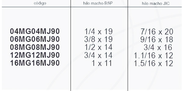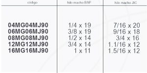 | Codigo | 04MG04MJ90 1/4 x 19 – 7/16 x 20, 06MG06MJ90 3/8 x 19 – 9/16 x 18, 08MG08MJ90 1/2 x 14 – 3/4 x 16, 12MG12MJ90 3/4 x 14 – 1.1/16 x 12, 16MG16MJ90 1 x 11 – 1.5/16 x 12 |