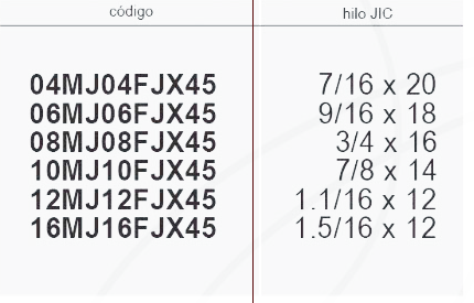| Codigo | 04MJ04FJX45 7/16 x 20, 06MJ06FJX45 9/16 x 18, 08MJ08FJX45 3/4 x 16, 10MJ10FJX45 7/8 x 14, 12MJ12FJX45 1.1/16 x 12, 16MJ16FJX45 1.5/16 x 12 |
