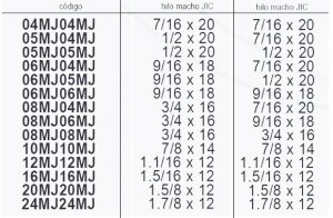 | Codigo | 04MJ04MJ 7/16 x 20 – 7/16 x 20, 05MJ04MJ 1/2 x 20 – 7/16 x 20, 05MJ05MJ 1/2 x 20 – 1/2 x 20, 06MJ04MJ 9/16 x 18 – 7/16 x 20, 06MJ05MJ 9/16 x 18 – 1/2 x 20, 06MJ06MJ 9/16 x 18 – 9/16 x 18, 08MJ04MJ 3/4 x 16 – 7/16 x 20, 08MJ06MJ 3/4 x 16 – 9/16 x 18, 08MJ08MJ 3/4 x 16 – 3/4 x 16, 10MJ10MJ 7/8 x 14 – 7/8 x 14, 12MJ12MJ 1.1/16 x 12 – 1.1/16 x 12, 16MJ16MJ 1.5/16 x 12 – 1.5/16 x 12, 20MJ20MJ 1.5/8 x 12 – 1.5/8 x 12, 24MJ24MJ 1.7/8 x 12 – 1.7/8 x 12 |