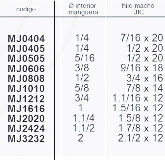 | Codigo | MJ0404 1/4 – 7/16 x 20, MJ0405 1/4 – 1/2 x 20, MJ0505 5/16 – 1/2 x 20, MJ0606 3/8 – 9/16 x 18, MJ0808 1/2 – 3/4 x 16, MJ1010 5/8 – 7/8 x 14, MJ1212 3/4 – 1.1/16 x 12, MJ1616 1 – 1.5/16 x 12, MJ2020 1.1/4 – 1.5/8 x 12, MJ2424 1.1/2 – 1.7/8 x 12, MJ3232 2 – 2.1/2 x 12 |