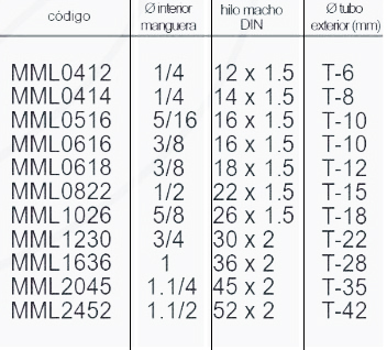 | Codigo | MML0412 1/4 – 12 x 1.5 – T-6, MML0414 1/4 – 14 x 1.5 – T-8, MML0516 5/16 – 16 x 1.5 – T-10, MML0616 3/8 – 16 x 1.5 – T-10, MML0618 3/8 – 18 x 1.5 – T-12, MML0822 1/2 – 22 x 1.5 – T-15, MML1026 5/8 – 26 x 1.5 – T-18, MML1230 3/4 – 30 x 2 – T-22, MML1636 1 – 36 x 2 – T-28, MML2045 1.1/4 – 45 x 2 – T-35, MML2452 1.1/2 – 52 x 2 – T-42 |