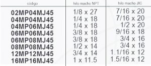 | Codigo | 02MP04MJ45 1/8 x 27 – 7/16 x 20, 04MP04MJ45 1/4 x 18 – 7/16 x 20, 04MP06MJ45 1/4 x 18 – 1/2 x 20, 06MP06MJ45 3/8 x 18 – 9/16 x 18, 06MP08MJ45 3/8 x 18 – 3/4 x 16, 08MP08MJ45 1/2 x 14 – 3/4 x 16, 12MP12MJ45 3/4 x 14 – 1.1/16 x 12, 16MP16MJ45 1 x 11.5 – 1.5/16 x 12 |