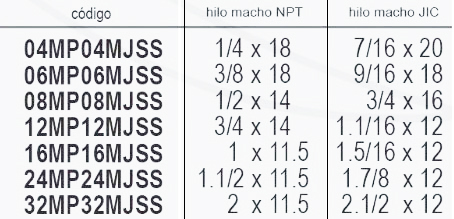 | Medidas | 04MP04MJSS 1/4×18 – 7/16×20, 06MP06MJSS 3/8×18 – 9/16×18, 08MP08MJSS 1/2×14 – 3/4×16, 12MP12MJSS 3/4×14 – 1.1/16×12, 16MP16MJSS 1×11.5 – 1.5/16×12, 24MP24MJSS 1.1/2×11.5 – 1.7/8×12, 32MP32MJSS 2×11.5 – 2.1/2×12 |