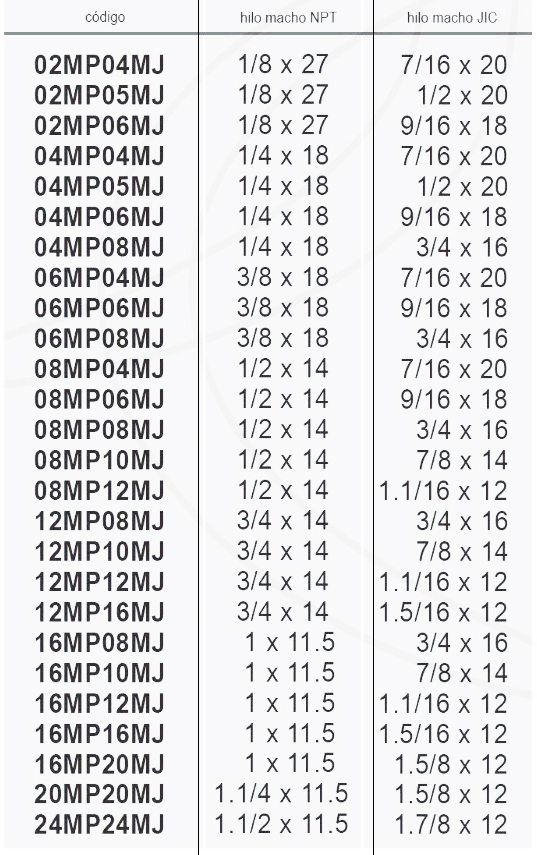 | Codigo | 02MP04MJ 1/8 x 27 – 7/16 x 20, 02MP05MJ 1/8 x 27 – 1/2 x 20, 02MP06MJ 1/8 x 27 – 9/16 x 18, 04MP04MJ 1/4 x 18 – 7/16 x 20, 04MP05MJ 1/4 x 18 – 1/2 x 20, 04MP06MJ 1/4 x 18 – 9/16 x 18, 04MP08MJ 1/4 x 18 – 3/4 x 16, 06MP04MJ 3/8 x 18 – 7/16 x 20, 06MP06MJ 3/8 x 18 – 9/16 x 18, 06MP08MJ 3/8 x 18 – 3/4 x 16, 08MP04MJ 1/2 x 14 – 7/16 x 20, 08MP06MJ 1/2 x 14 – 9/16 x 18, 08MP08MJ 1/2 x 14 – 3/4 x 16, 08MP10MJ 1/2 x 14 – 7/8 x 14, 08MP12MJ 1/2 x 14 – 1.1/16 x 12, 12MP08MJ 3/4 x 14 – 3/4 x 16, 12MP10MJ 3/4 x 14 – 7/8 x 14, 12MP12MJ 3/4 x 14 – 1.1/16 x 12, 12MP16MJ 3/4 x 14 – 1.5/16 x 12, 16MP08MJ 1 x 11.5 – 3/4 x 16, 16MP10MJ 1 x 11.5 – 7/8 x 14, 16MP12MJ 1 x 11.5 – 1.1/16 x 12, 16MP16MJ 1 x 11.5 – 1.5/16 x 12, 16MP20MJ 1 x 11.5 – 1.5/8 x 12, 20MP20MJ 1.1/4 x 11.5 – 1.5/8 x 12, 24MP24MJ 1.1/2 x 11.5 – 1.7/8 x 12 |