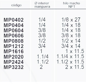 | Codigo | MP0402 1/4 – 1/8 x 27, MP0404 1/4 – 1/4 x 18, MP0604 3/8 – 1/4 x 18, MP0606 3/8 – 3/8 x 18, MP0808 1/2 – 1/2 x 14, MP1212 3/4 – 3/4 x 14, MP1616 1 – 1 x 11.5, MP2020 1.1/4 – 1.1/4 x 11.5, MP2424 1.1/2 – 1.1/2 x 11.5, MP3232 2 – 2 x 11.5 |