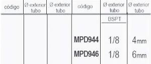 | Codigos | MPD944 1/8BSPT – 4mm, MPD946 1/8BSPT – 6mm |