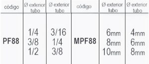 | Codigo | PF88 3/16 – 5/32, PF88 1/4 – 3/16, PF88 3/8 – 1/4, PF88 1/2 – 3/8, MPF88 6mm – 4mm, MPF88 8mm – 6mm, MPF88 10mm – 8mm, MPF88 12mm – 10mm |