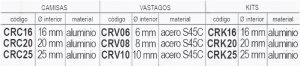 | Medidas | CRC16 – 16mm – aluminio, CRC20 – 20mm – aluminio, CRC25 – 25mm – aluminio, CRV06 – 6mm – acero S45C, CRV08 – 8mm – acero S45C, CRV10 – 10mm – acero S45C, CRK16 – 16mm – aluminio, CRK20 – 20mm – aluminio, CRK25 – 25mm – aluminio |