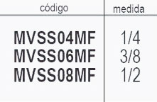 | Codigo | MVSS04MF 1/4, MVSS06MF 3/8, MVSS08MF 1/2 |