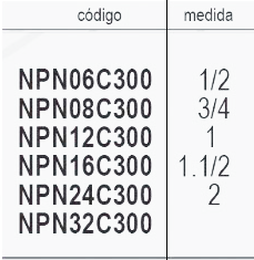 | codigo | NPN06C300 1/2, NPN08C300 3/4, NPN12C300 1, NPN16C300 1.1/2, NPN24C300 2 |