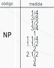 | Codigo | NP-1/4, NP-3/8, NP-1/2, NP-3/4, NP-1, NP-1.1/4, NP-1.1/2, NP-2, NP-2.1/2, NP-3, NP-4 |