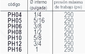 | Codigo | PH04 1/4 – 290psi max, PH05 5/16 – 290psi max, PH06 3/8 – 290psi max, PH08 1/2 – 290psi max, PH10 5/8 – 290psi max, PH12 3/4 – 290psi max, PH16 1 – 290psi max |