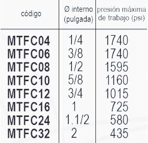 | Codigo | MTFC04 1/4 – 1740psi max, MTFC06 3/8 – 1740psi max, MTFC08 1/2 – 1595psi max, MTFC10 5/8 – 1160psi max, MTFC12 3/4 – 1015psi max, MTFC16 1 – 725psi max, MTFC24 1.1/12 – 580psi max, MTFC32 2 – 435psi max |