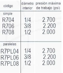 | Codigo | R704 1/4 – 2.700, R706 3/8 – 2.200, R708 1/2 – 2.000, R7PL04 1/4 – 2.700, R7PL06 3/8 – 2.200, R7PL08 1/2 – 2.000 |