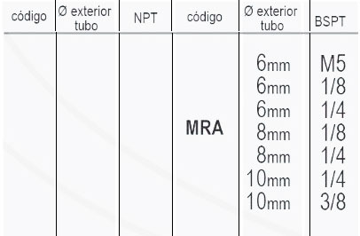 | Codigo | MRA-6mm-M5, MRA-6mm-1/8, MRA-6mm-1/4, MRA-8mm-1/8, MRA-8mm-1/4, MRA-10mm-1/4, MRA-10mm-3/8 |