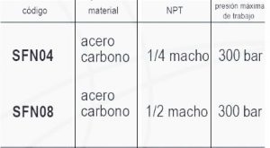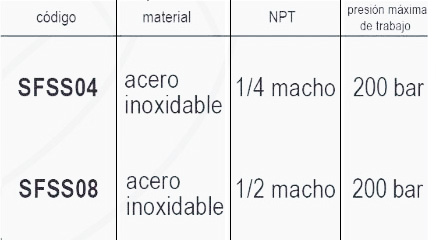 | Codigo | SFN04 acero carbono – 1/4 macho – 300 bar, SFN08 acero carbono – 1/2 macho – 300 bar, SFSS04 acero inoxidable – 1/4 macho – 200 bar, SFSS04 acero inoxidable – 1/2 macho – 200 bar |