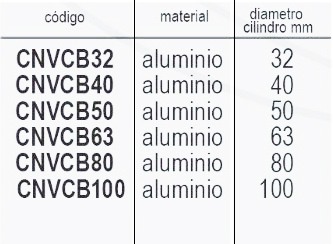 | codigo | CNVCB32 aluminio – 32, CNVCB40 aluminio – 40, CNVCB50 aluminio – 50, CNVCB63 aluminio – 63, CNVCB80 aluminio – 80, CNVCB100 aluminio – 100 |