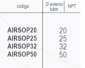 | Codigo | AIRSOP20 20, AIRSOP25 25, AIRSOP32 32, AIRSOP50 50 |