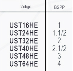 | Codigo | UST16HE – 1, UST24HE – 1.1/2, UST32HE – 2, UST40HI – 2.1/2, UST48HE – 3, UST64HE – 4 |