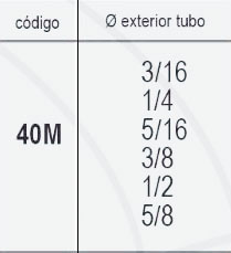 | Codigo | 40M 3/16, 40M 1/4, 40M 5/16, 40M 3/8, 40M 1/2, 40M 5/8 |
