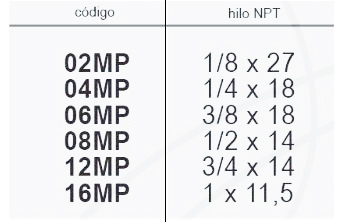 02MP 1/8 x 27, 04MP 1/4 x 18, 06MP 3/8 x 18, 08MP 1/2 x 14, 12MP 3/4 x 14, 16MP 1 x 11.5