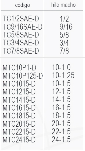 | Codigo | TC1/SAE-D – 1/2, TC9/16SAE-D – 9/16, TC5/8SAE-D – 5/8, TC3/4SAE-D – 3/4, TC7/8SAE-D – 7/8, MTC10P1-D – 10-1.0, MTC10P125-D – 10-1.25, MTC1015-D – 10-1.5, MTC1215-D – 12-1.5, MTC1415-D – 14-1.5, MTC1615-D – 16-1.5, MTC1815-D – 18-1.5, MTC2015-D – 20-1.5, MTC2215-D – 22-1.5, MTC2415-D – 24-1.5 |