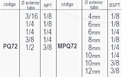 | Codigo | PQ72 3/16 – 1/8, PQ72 1/4 – 1/8, PQ72 1/4 – 1/4, PQ72 3/8 – 1/4, PQ72 1/2 – 3/8, MPQ72 4mm – 1/8, MPQ72 6mm – 1/8, MPQ72 6mm – 1/4, MPQ72 8mm – 1/8, MPQ72 8mm – 1/4, MPQ72 10mm – 1/4, MPQ72 10mm – 3/8, MPQ72 12mm – 3/8 |