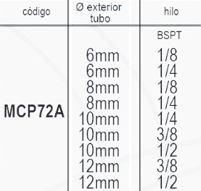 | Codigo | MCP72A 6mm – 1/8, MCP72A 6mm – 1/4, MCP72A 8mm – 1/8, MCP72A 8mm – 1/4, MCP72A 10mm – 1/4, MCP72A 10mm – 3/8, MCP72A 10mm – 1/2, MCP72A 12mm – 3/8, MCP72A 12mm – 1/2 |