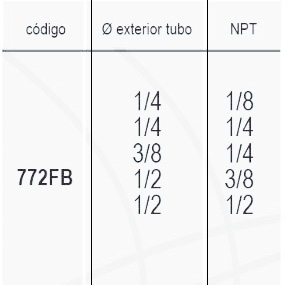 | Codigo | 772FB 1/4 – 1/8, 772FB 1/4 – 1/4, 772FB 3/8 – 1/4, 772FB 1/2 – 3/8, 772FB 1/2 – 1/2 |