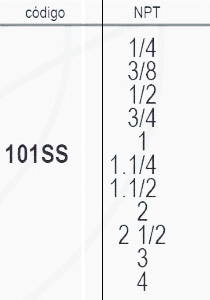 | Codigo | 101SS 1/4, 101SS 3/8, 101SS 1/2, 101SS 3/4, 101SS 1, 101SS 1.1/4, 101SS 1.1/2, 101SS 2, 101SS 2.1/2, 101SS 3, 101SS 4 |