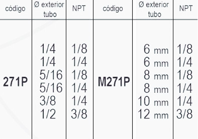 | Codigo | 271P 1/4 – 1/8, 271P 1/4 – 1/4, 271P 5/16 – 1/8, 271P 5/16 – 1/4, 271P 3/8 – 1/4, 271P 1/2 – 3/8, M271P 6mm – 1/8, M271P 6mm – 1/4, M271P 8mm – 1/8, M271P |
