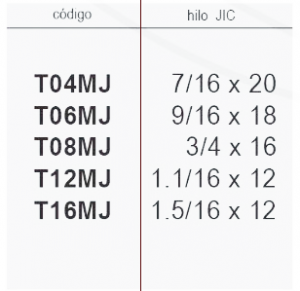 T04MJ 7/16 x 20, T06MJ 9/16 x 18, T08MJ 3/4 x 16, T12MJ 1.1/16 x 12, T16MJ 1.5/16 x 12