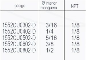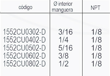 1552CU0302-D 3/16 interior – 1/8NPT, 1552CU0402-D 1/4 interior – 1/8NPT, 1552CU0502-D 5/16 interior – 1/8NPT, 1552CU0602-D 3/8 interior – 1/8NPT, 1552CU0802-D 1/2interior – 1/8NPT